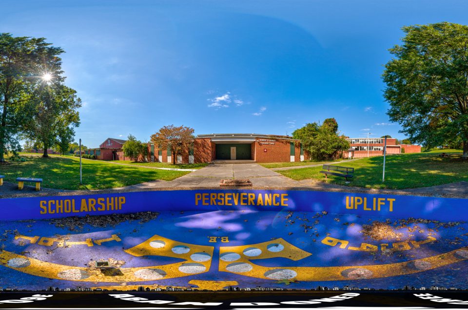 A 360-degree panoramic image in an equirectangular projection at the Town of Spectre in Alabama. Image by Ray Velez