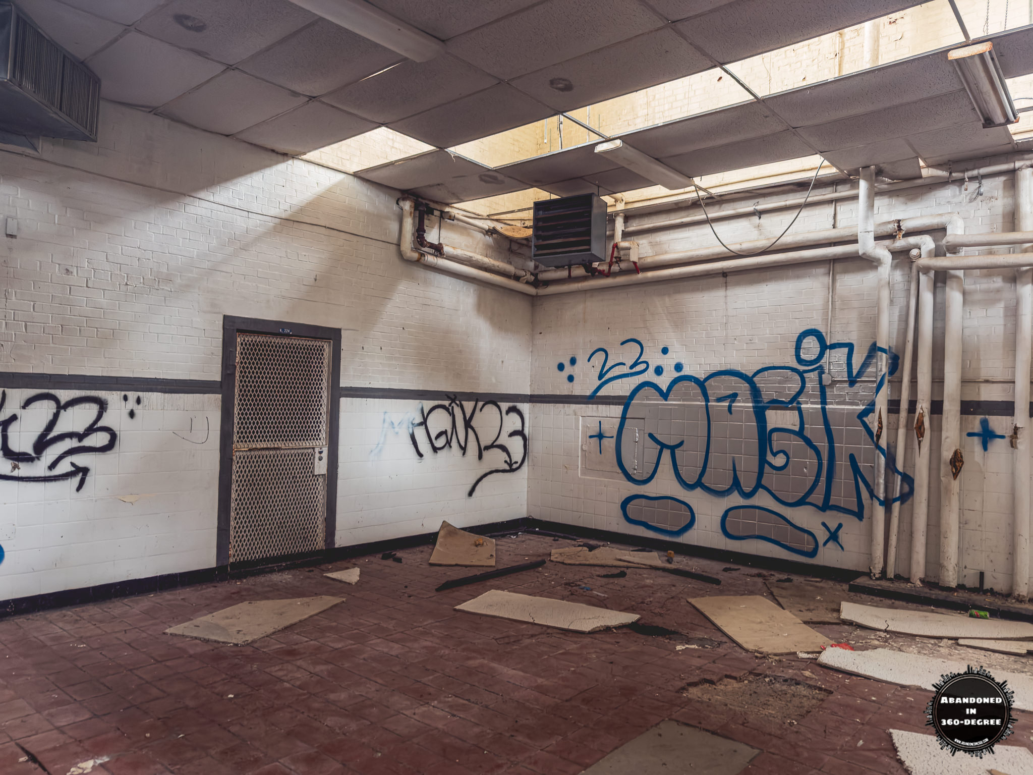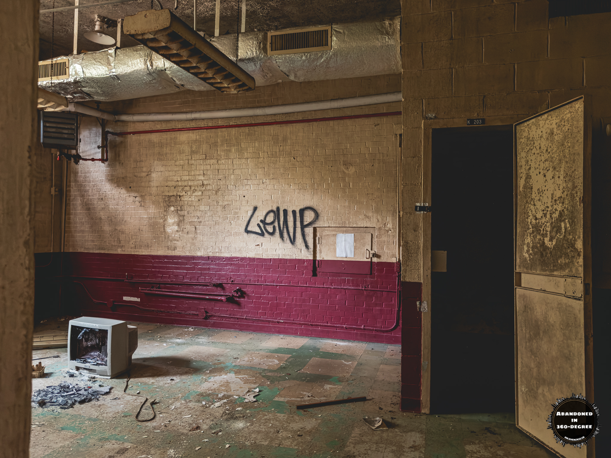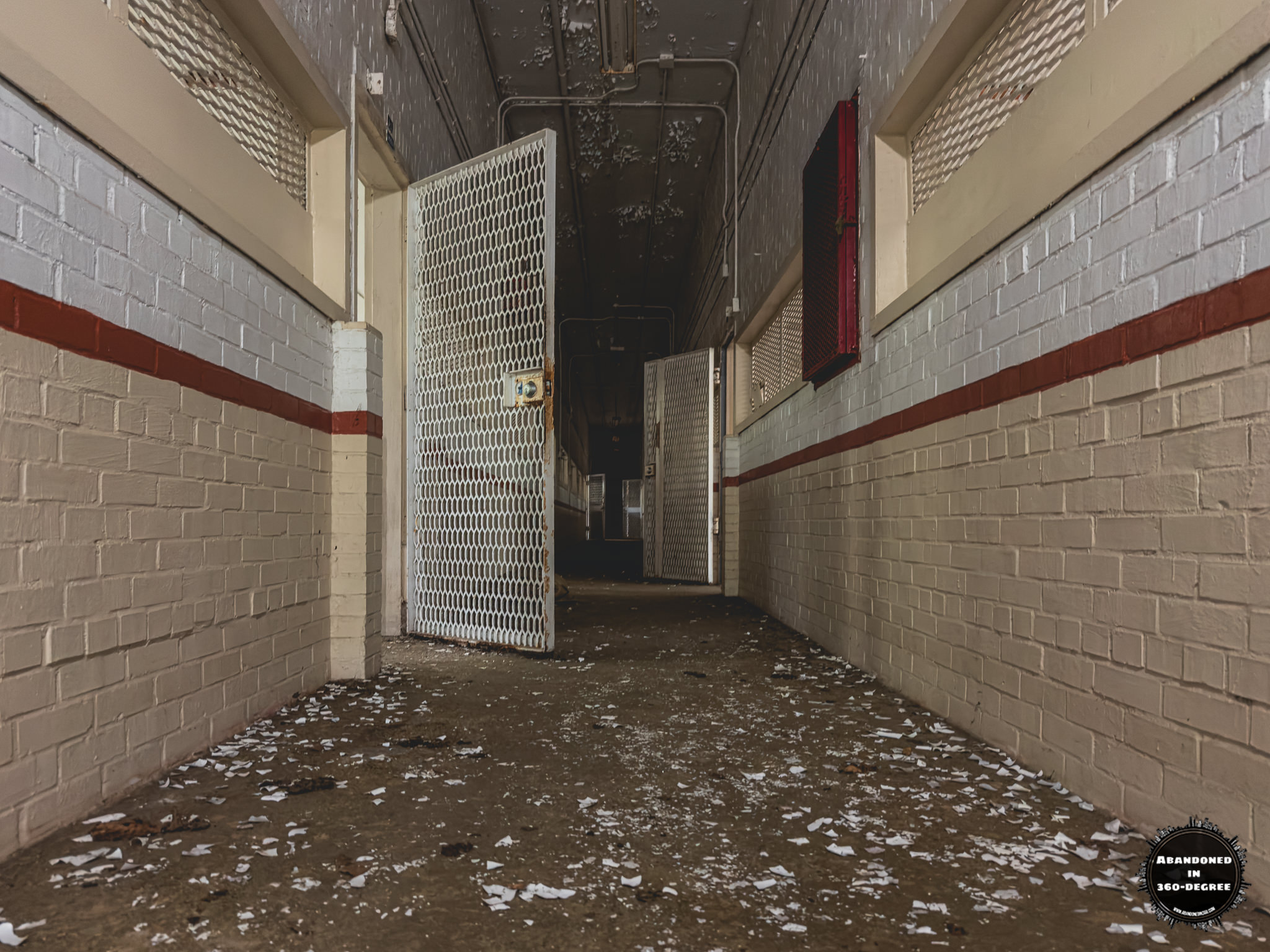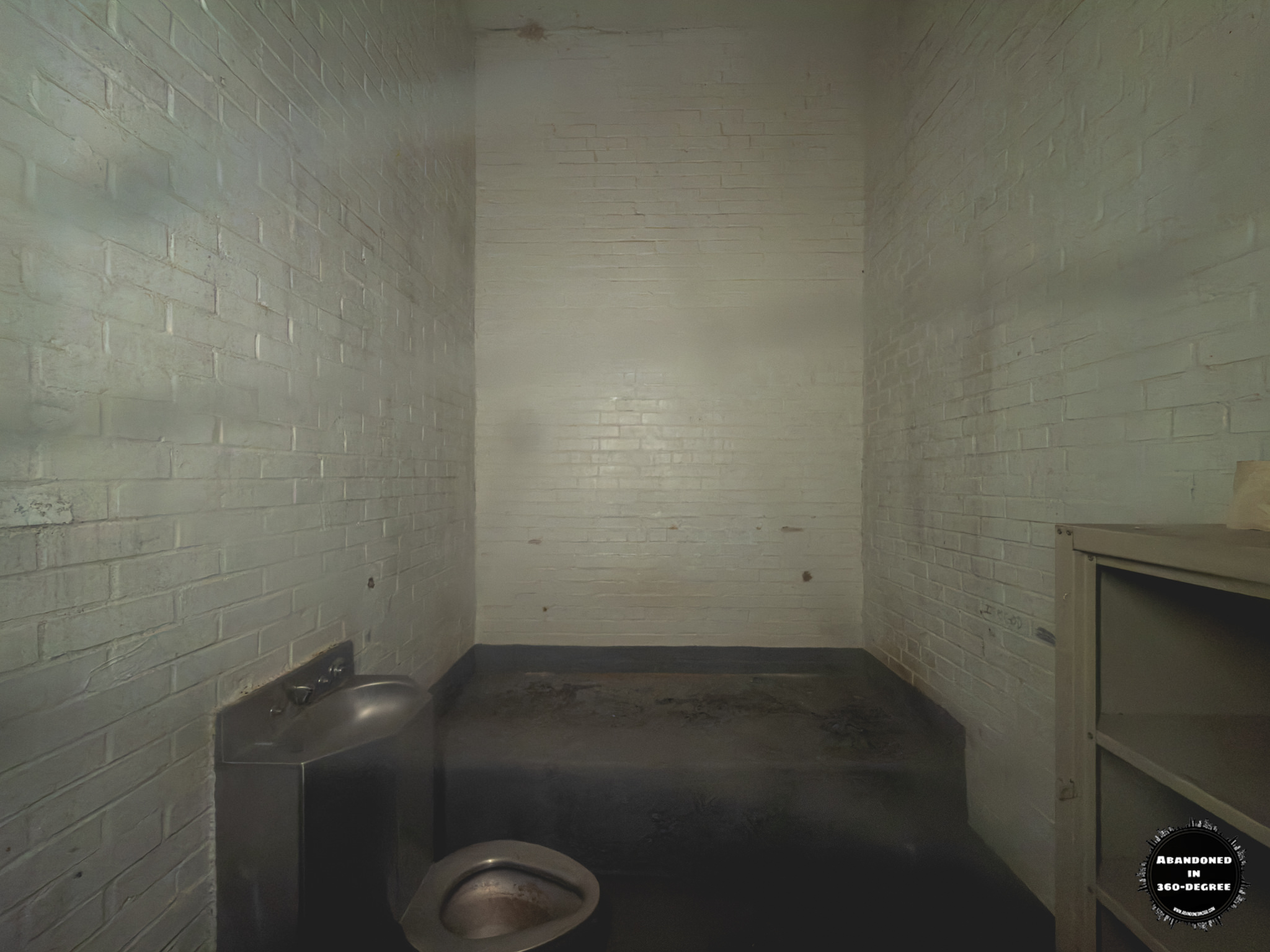 A 360-degree panoramic image captured inside the abandoned Alan Kemper Building at the Scott State Prison in Milledgeville, Georgia. Photo by the Abandoned in 360 URBEX Team