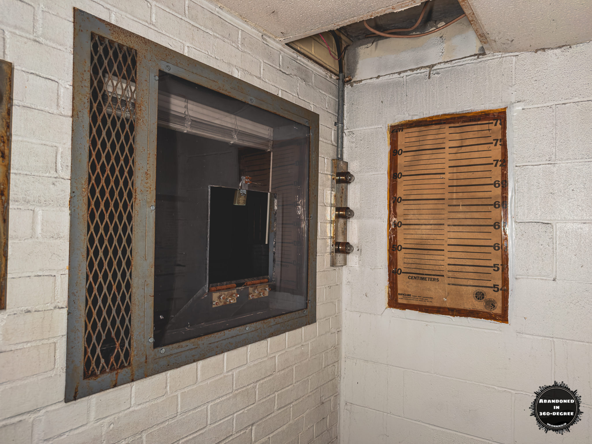 On the second floor (accessed by two metal staircases), the arrangement is similar. Upper halls contain cells and a few larger rooms that were probably offices or clinics. In one upstairs corner sits an old jailor’s kiosk with bulletproof glass (now cracked or missing). Nearby is a faded chalkboard frame where daily counts were once written. Offices along the second floor hall have broken windows and overturned desks inside.