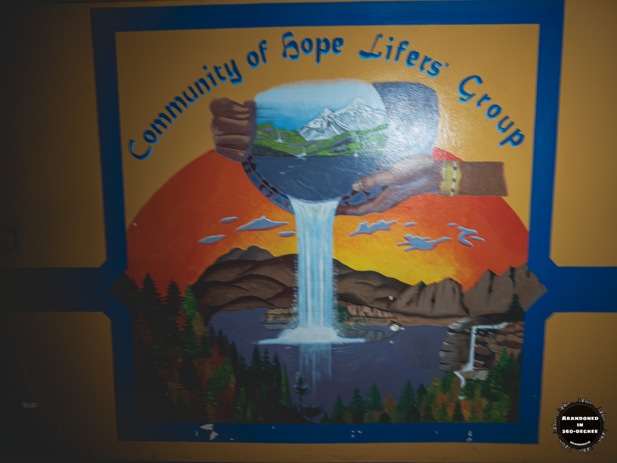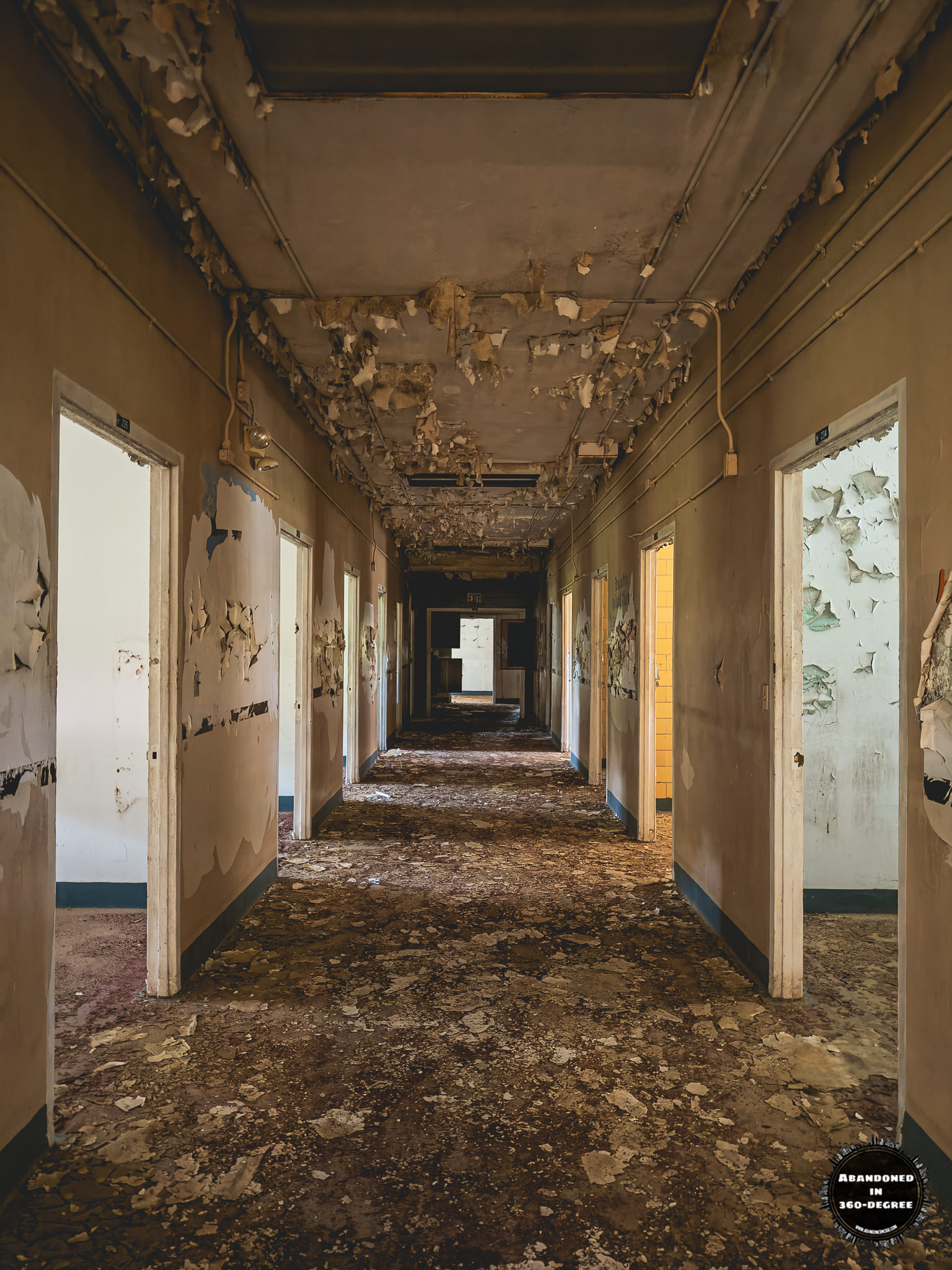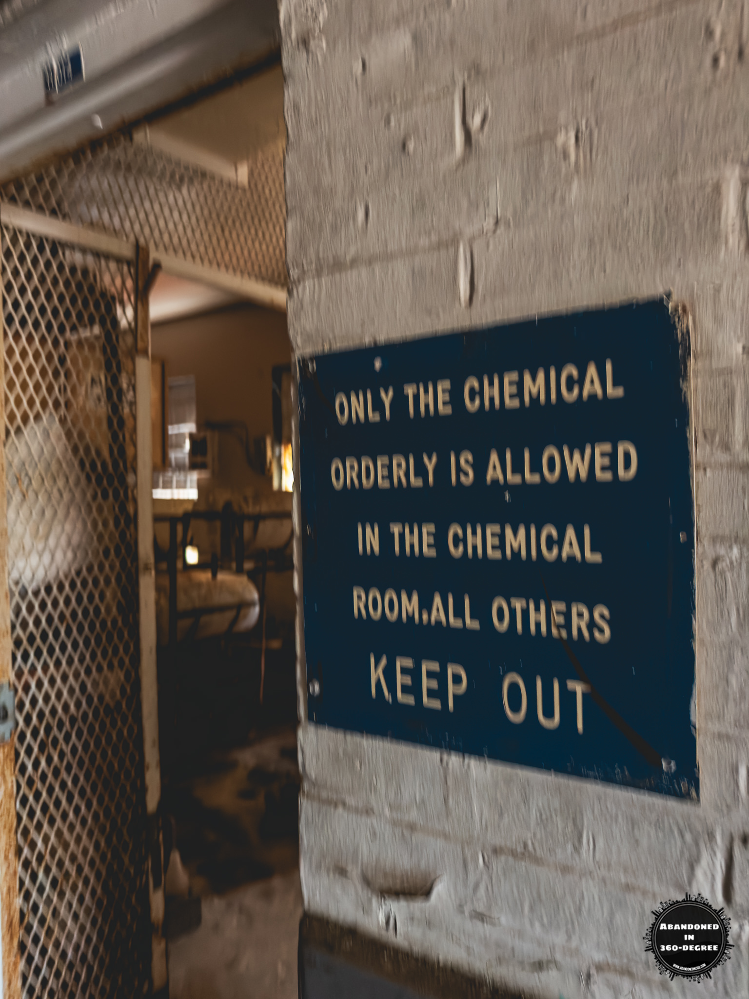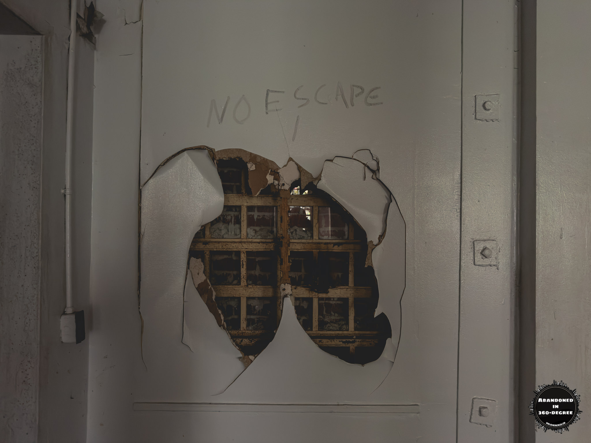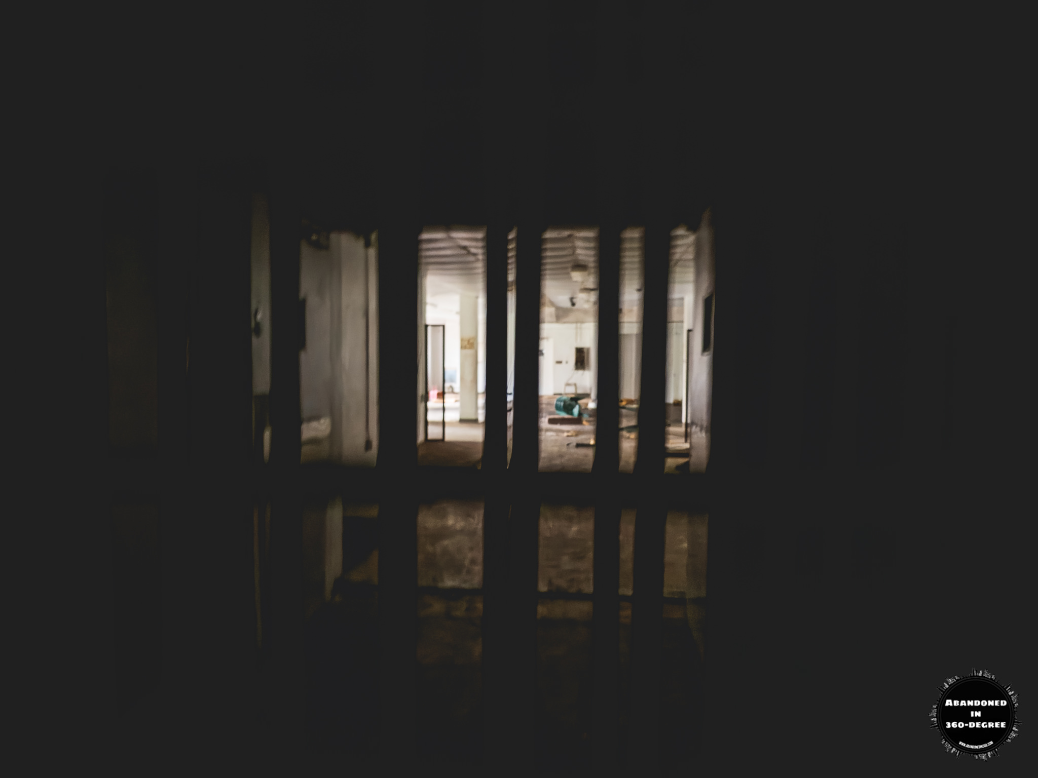 A 360-degree panoramic image captured inside the abandoned Holly Building at the Scott State Prison at Milledgeville, Georgia. Photo by the Abandoned in 360 URBEX Team.