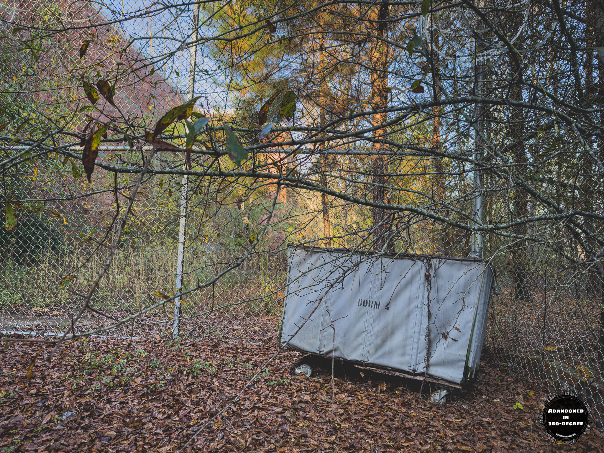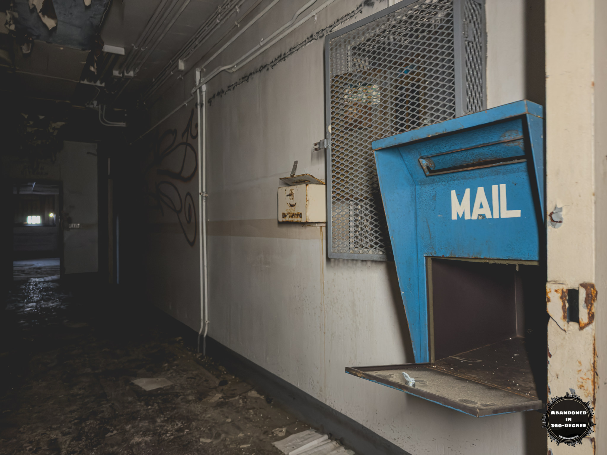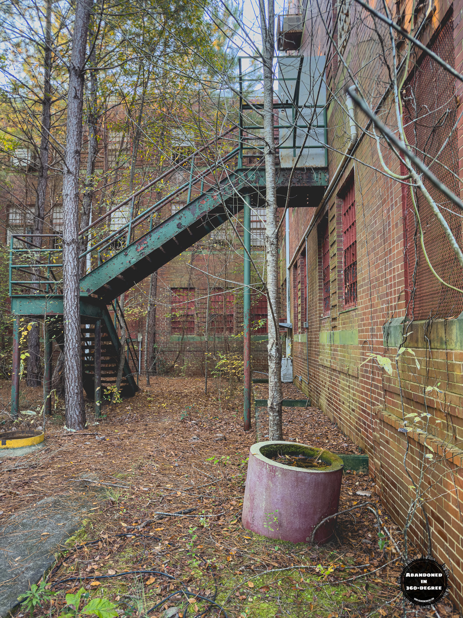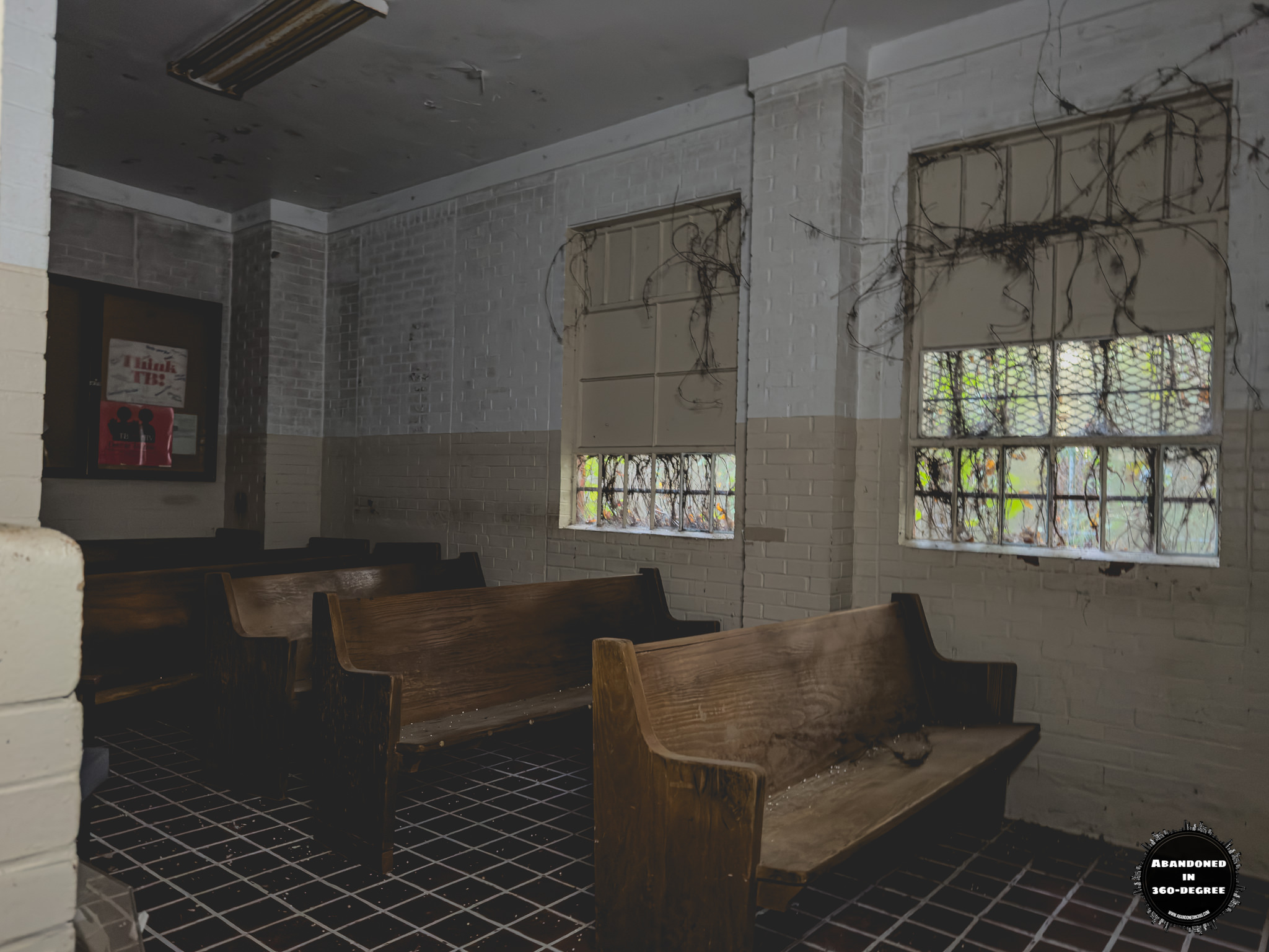 A 360-degree panoramic image captured at the abandoned Rivers State Prison in Milledgeville, Georgia. This photo shows the entrance to the Rivers South Building. Photo by the Abandoned in 360 Urbex Team.